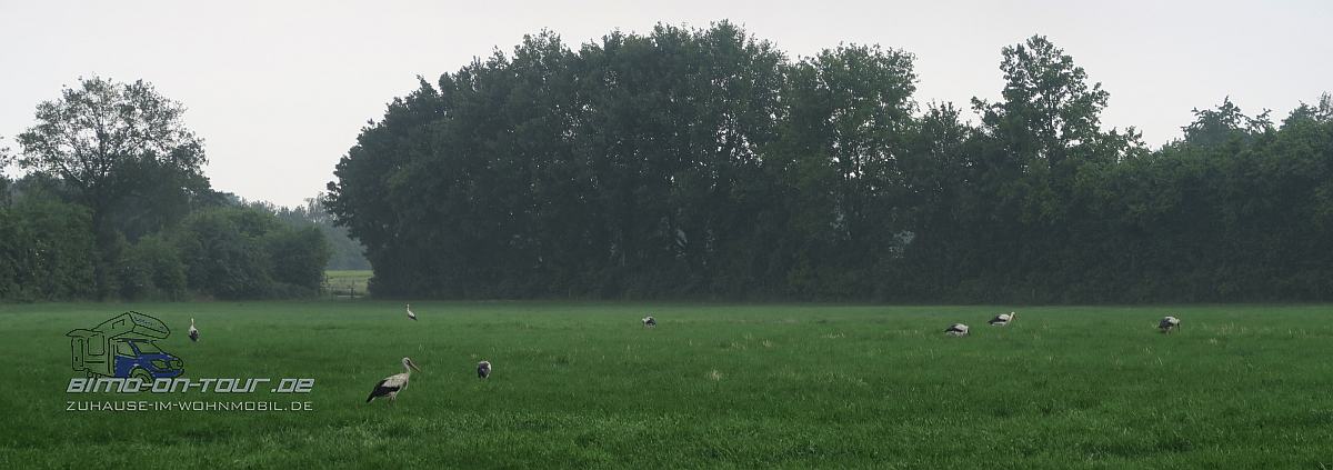 Überall in Deutschland gewitterte es übel, aber wo wir sind, scheint ja meist die Sonne. Doch, ein paar Tropfen fielen plötzlich und die lockten ein Geschwader Störche auf die nahe Wiese. Wahrscheinlich kroch nun alles Futter aus dem Boden.