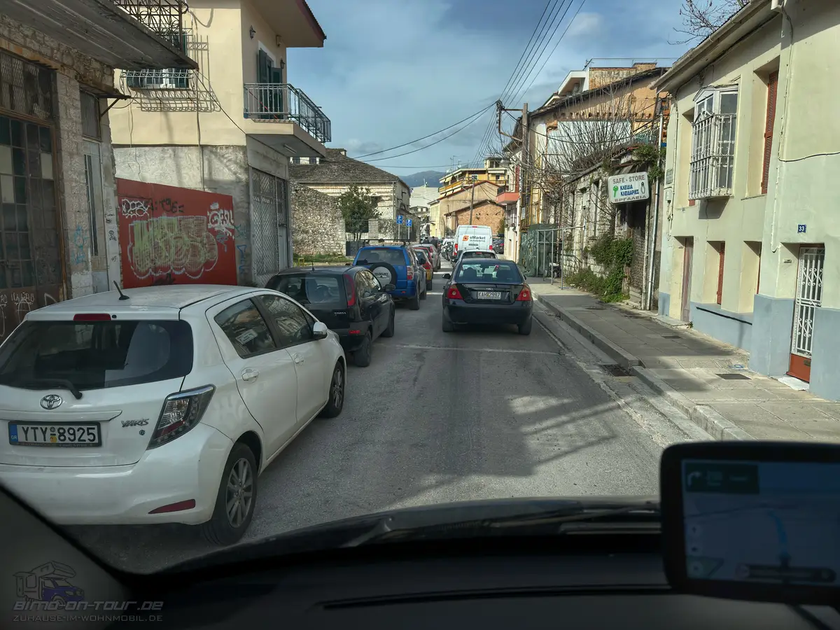 Den nur über eine schmale Straße zu erreichenden Platz war wieder einmal eine kleine Herausforderung. Bedingt durch eine Baustelle mussten wir uns ohne Navi, das eh versagt hätte, mit PocketEarth einen Weg durch die Altstadt suchen. Glücklicherweise sind in PocketEarth auch die Einbahnstraßen vermerkt, so dass wir einen Weg durch das Labyrinth der Gassen gefunden hatten. Wobei die Gassen weniger das Problem darstellen, eher die griechische Art zu parken. Aber, hat doch gepasst…