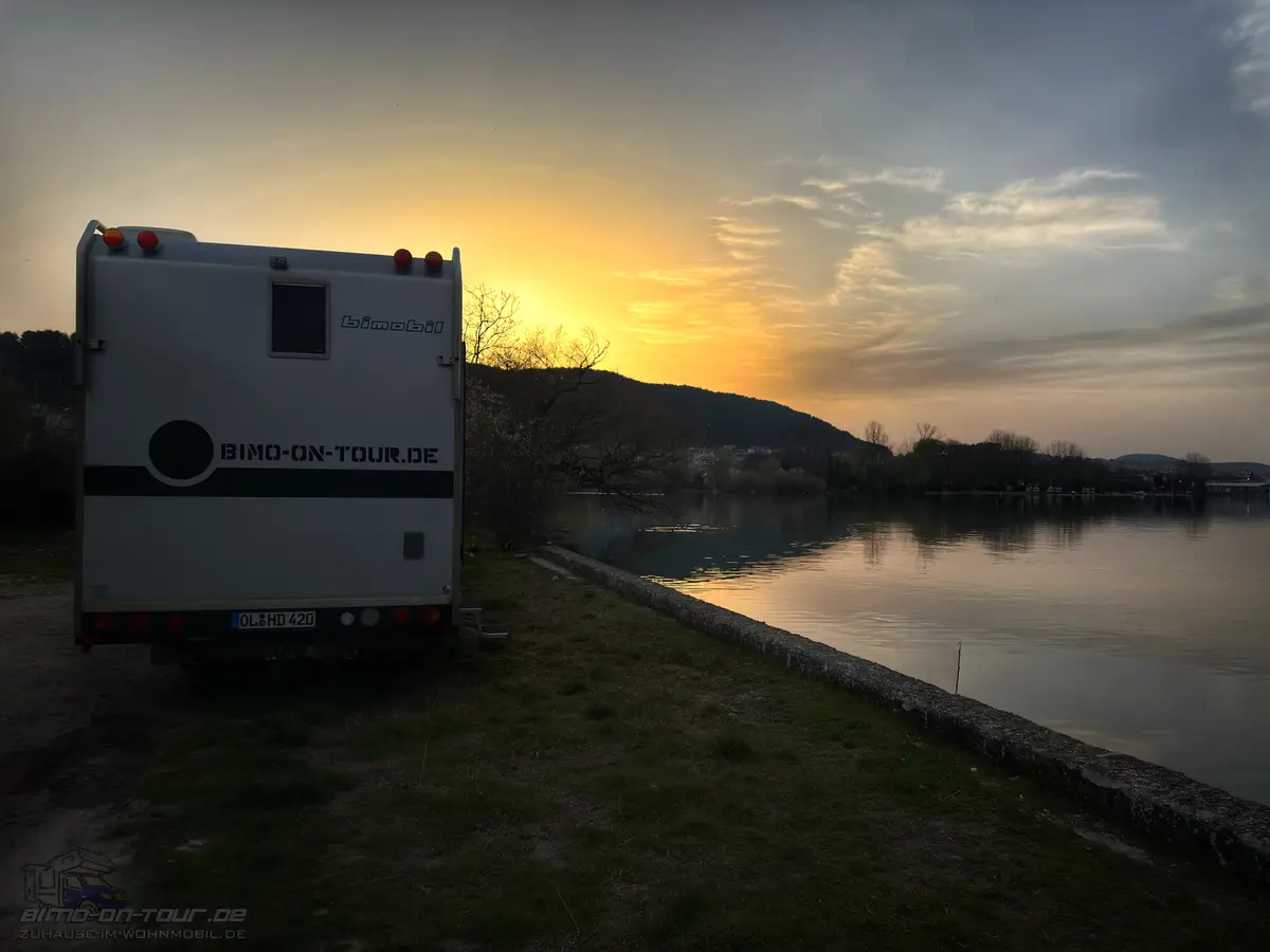 Der im Abseits und mit Sichtschutz gelegene Platz, wo wir schon die letzten Male standen, ist gefühlt der einzige Platz ohne Verbotsschilder wo man in der Stadt unbehelligt Nächtigen kann.