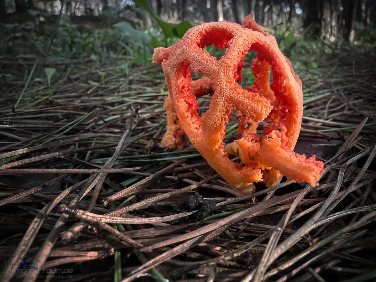 Passend hierzu entdeckten wir einen noch nie gesehenen skurrilen Pilz, einen roten Gitterling. Den hielten wir zunächst für ein Kinderspielzeug, aber dazu war er zu filigran. Google lieferte uns dann die Erklärung.