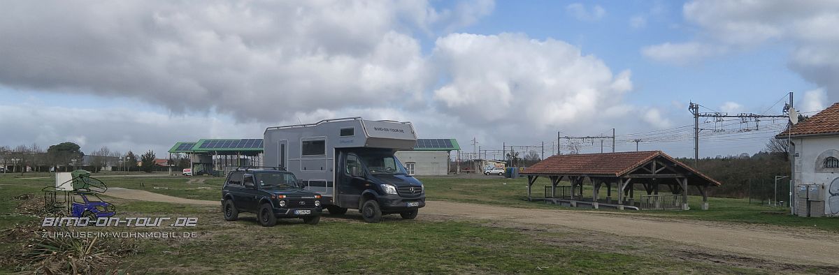 Der kleine Ort Morcenx liegt ziemlich genau östlich von Contis am Atlantik. Hier befindet sich ein kleiner nicht so hübscher und lauter kostenloser Stellplatz (GoogleMaps), eigentlich nur ne Wiese im Ort am Bahnhof mit Industrie, aber mit Entsorgung…
