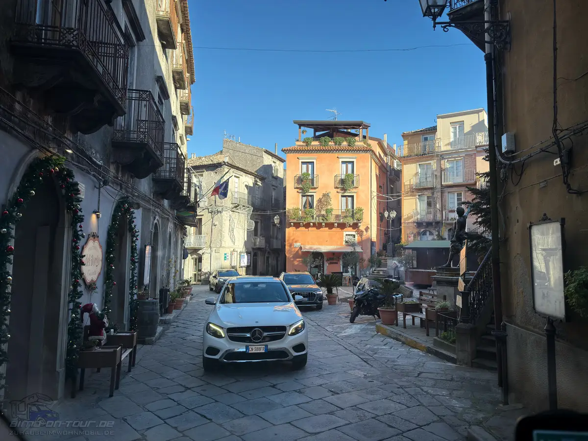 Wie ich schon vermutet hatte, wurde es in dem kleinen wunderschönen Bergort Novara di Sicilia besonders Spannend. Die Hauptstraße ist eigentlich nichts anderes als eine enge, ca. 3,5 m breite gepflasterte Gasse. Dort kommen nicht mal 2 PKW aneinander vorbei.