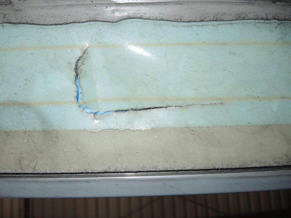 Gesehen hatte ich den Schaden dann erst, als ich unter dem Wohnmobil lag und die Hybriden angezogen hatte. Wahrscheinlich hatte sich irgendwo auf einem Stellplatz ein Eisenteil zwischen den Zwillingen gequetscht und ist dann auf der Landstraße bei höherer Geschwindigkeit heraus geflogen und hat den 8 cm dicken Sandwich-Unterboden fast durchschlagen.